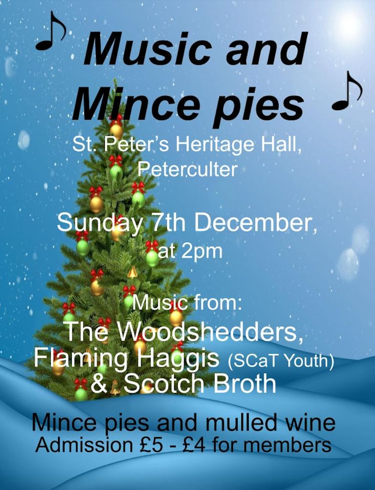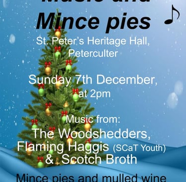 We had a lovely afternoon of music, mulled wine and mince pies on Saturday, 2nd December 2023. The music was provided by The Woodshedders (Culter Men's Shed), Hazlehead Ceilidh Band led by Susan Simpson, and Scotch Broth.